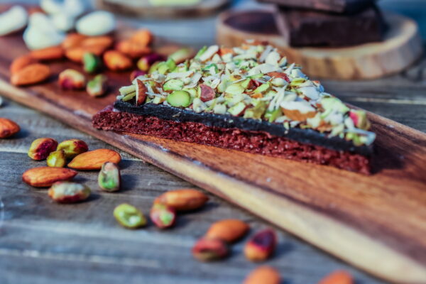 A dark chocolate sweet base generously topped with luscious chocolate fudge and a delightful medley of pistachios, cashews, and almond slices for a nutty, and fudgy delight.
